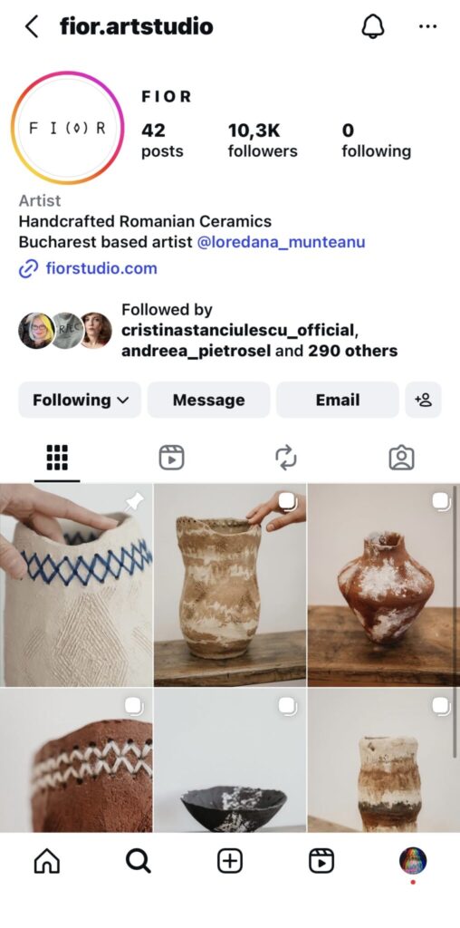 12. Fior Art Studio este spațiul în care creează în prezent Loredana Munteanu piesele unicat din ceramică. După studiile începute în atelierul Victoria Finală din București, continuate la Meridiana (în Toscana), la Shigaraki (Japonia), la Bergamo și Atena, Loredana și-a deschis acest loc pe Strada Semicercului, tot în Cartierul Creativ. Din când în când are open doors, fiți pe fază, anunță de fiecare dată pe contul său de Instagram, @fior.artstudio.