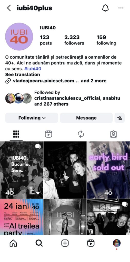 9. @iubi40plus este un concept lansat în această vară de Oana Igrisan, Alina Vâlcu, Cătălin Rusu și Bogdan Tătaru (cu Alina și cu Bogdan am fost colegă la Saatchi & Saatchi, acum 23 de ani ). Petrecerile Iubi 40 se întâmplă la Apollo, se dansează pe muzica rulată de Eugen Rădescu și se fac și dedicații. La fiecare ediție se fac dedicații, iar fiecare dedicație înseamnă bani donați pentru o cauză. La ediția din 24 ianuarie se strâng bani pentru Hope and Homes Romania. Biletele s-au pus deja în vânzare și sunt aproape sold out.